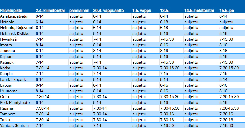 Kevät tuo tullessaan poikkeuksia aukioloaikoihimme. Täältä löydät tulevien pyhien seudun aukioloajat palvelupistekohtaisesti.